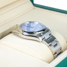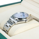 Rolex Oyster Perpetual 34 with lavender dial, featuring a 34mm Oystersteel case and a smooth bezel. Powered by the self-winding Calibre 2232 movement, it delivers a 55-hour power reserve. This elegant Rolex watch combines timeless style with everyday practicality.