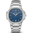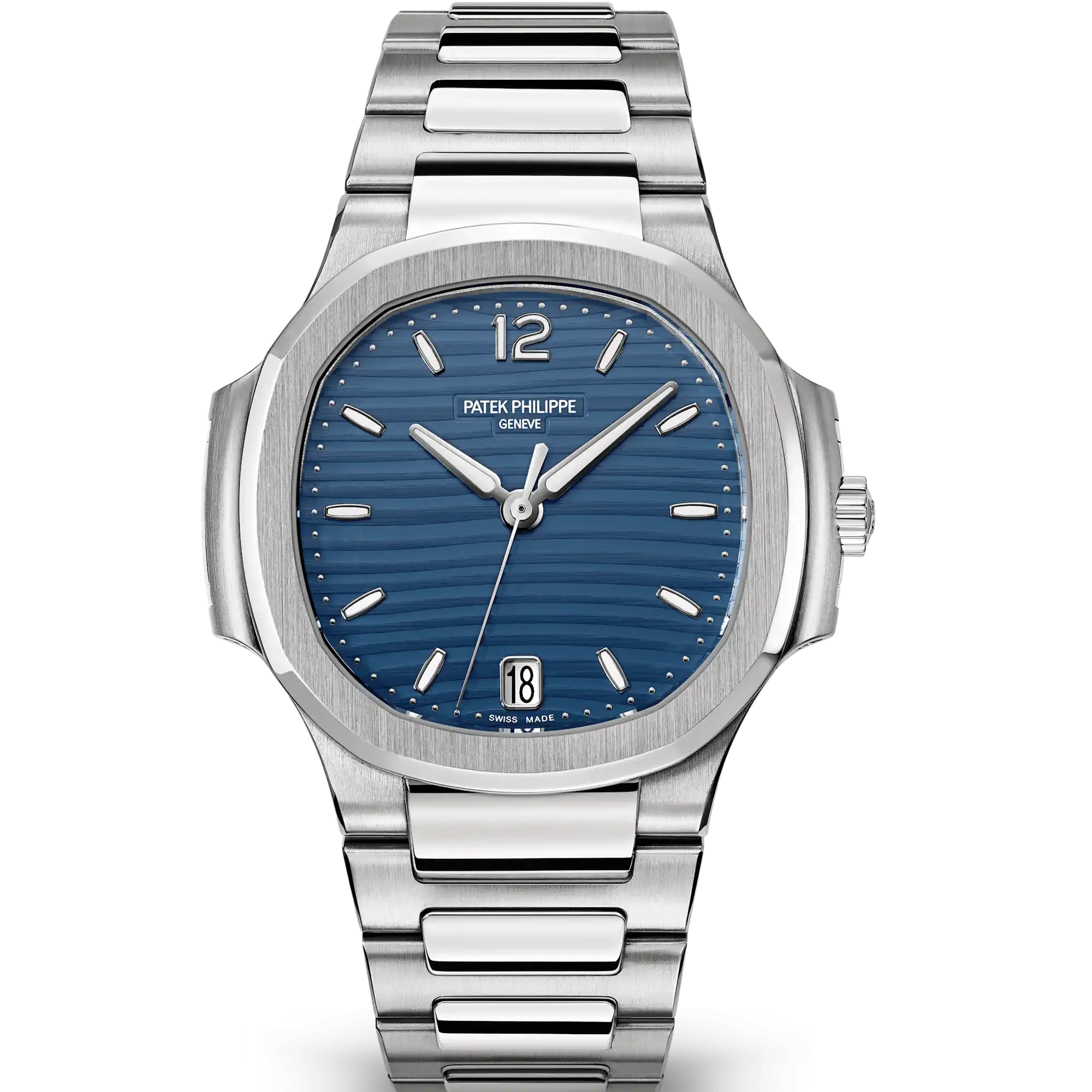 The Patek Philippe Nautilus Women's Watch 7118/1A-001 is a stylish, stainless steel luxury sports watch for women. Its 35.2 mm case features a striking blue opaline dial with embossed wave patterns and luminescent gold hour markers. Powered by the automatic caliber 26-330 S C, it displays the date, hours, minutes, and...