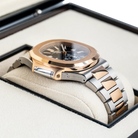 The Patek Philippe Nautilus 5980/1AR masterfully blends luxury and sport in an iconic design. Its stunning blue dial captivates with a gradient effect, creating a refined backdrop for the chronograph sub-dial. This 40.5mm masterpiece is crafted in two-tone stainless steel and rose gold, offering a striking contrast that exudes elegance...