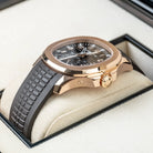 The Patek Philippe Aquanaut Travel Time 5164R/001 combines a rose gold case with a stunning chocolate brown embossed dial, creating a warm and sophisticated aesthetic. Its "chocolate" dial features a unique checkerboard pattern that provides a rich texture and depth. The integrated brown rubber strap is both comfortable and durable,...