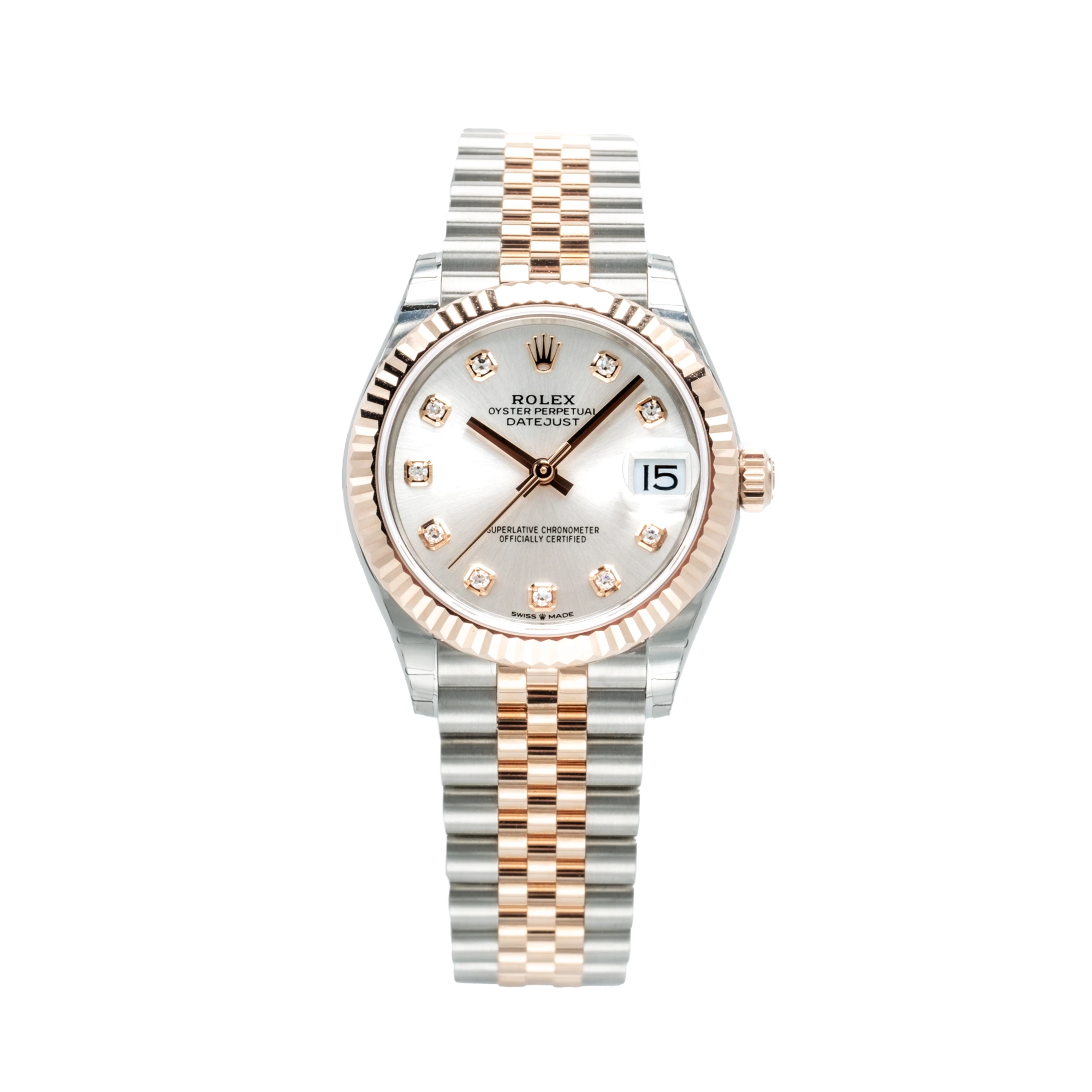 A stainless steel Datejust with a white gold fluted bezel, combining elegance with everyday versatility.