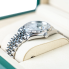 This Rolex Datejust 36 features a mother-of-pearl dial with 10 diamond-set hour markers, set in a 36 mm Oystersteel case with an 18 ct white gold fluted bezel. The watch is fitted with the iconic Jubilee bracelet, which combines polished center links with brushed outer links for comfort and durability....