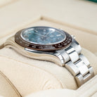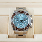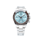 This pre-owned Rolex Daytona 116506 features a 40mm platinum case, a chestnut brown Cerachrom bezel, and a unique ice blue dial with factory diamond hour markers. Available only on platinum models, this dial adds a rare and sophisticated touch to this iconic chronograph.