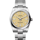 The Rolex Oyster Perpetual 34 with beige dial features a 34mm Oystersteel case with a polished bezel. It's equipped with Chromalight luminescent indices. Powered by the self-winding Caliber 2232, it offers a 55-hour power reserve. This versatile Rolex watch perfectly blends classic design with everyday wearing comfort.