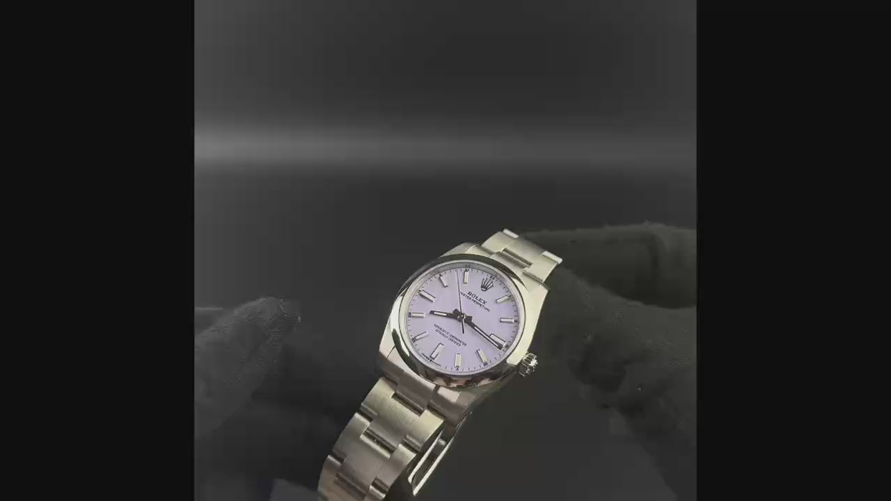 Rolex Oyster Perpetual 34 with lavender dial, featuring a 34mm Oystersteel case and a smooth bezel. Powered by the self-winding Calibre 2232 movement, it delivers a 55-hour power reserve. This elegant Rolex watch combines timeless style with everyday practicality.