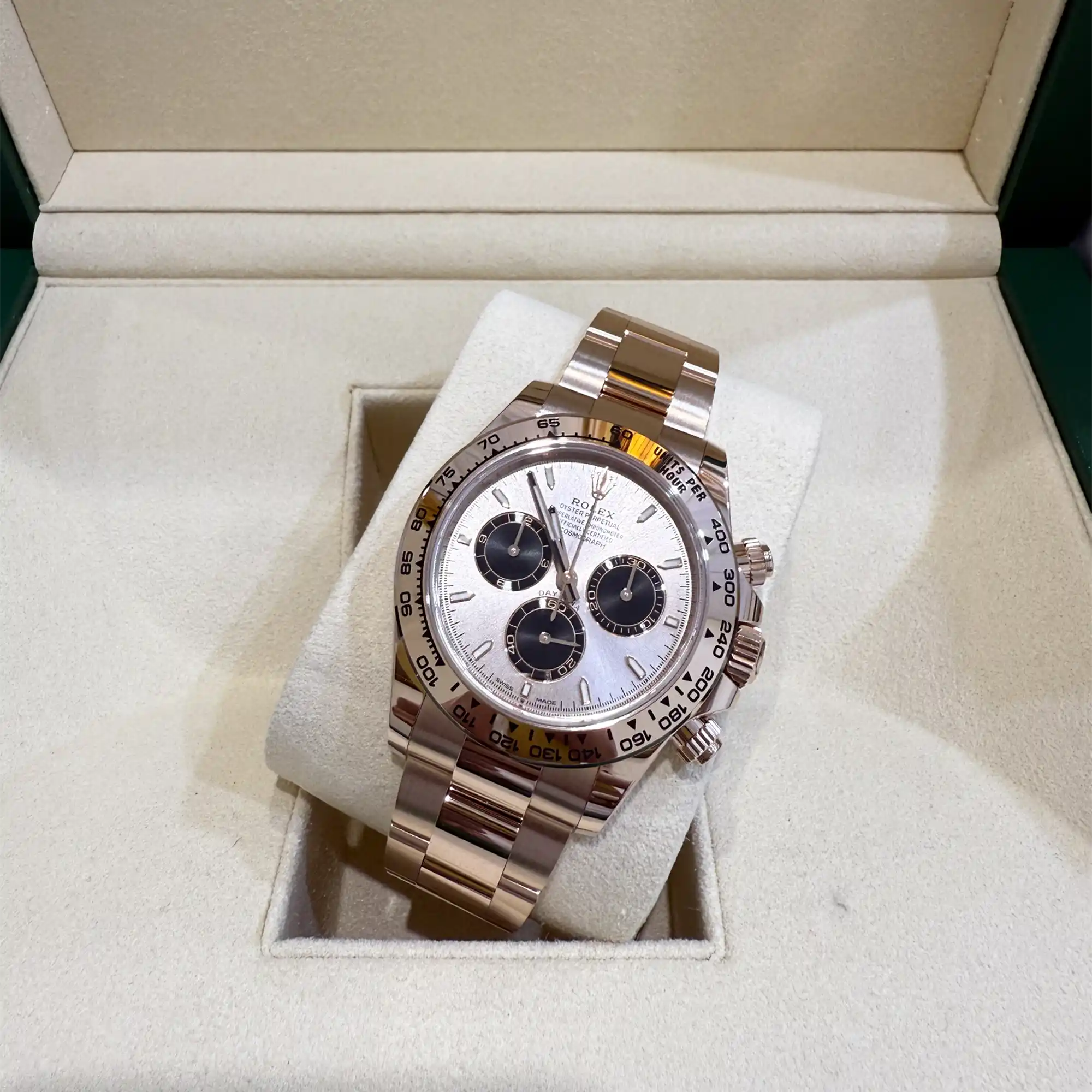 The Rolex Daytona rose gold 126505 showcases a 40mm Everose gold case and a refined sundust dial. Its 18k Everose gold Oyster bracelet delivers comfort and style. The chronograph offers precise timekeeping, perfect for timing races or daily use. The warm tones of the sundust dial blend beautifully with the...